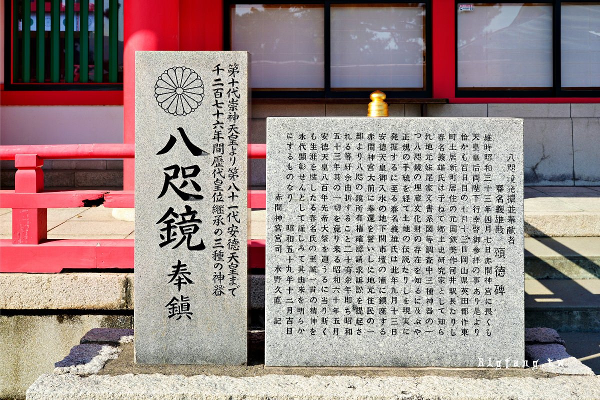 赤間神宮祭祀著在海中去世的安德天皇,據說當年日本皇室的三神器之一「八咫鏡」也隨之沉入海底。不過根據歷史記載,這面神鏡後來被潛水員找回,並送回京都保存。