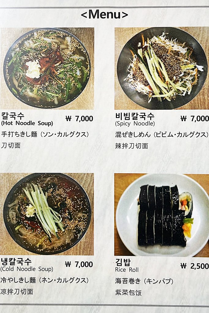 牆上的菜單只有韓文,紙本菜單有中文,這裡的東西很簡單,就 刀切麵(熱)、涼刀切麵、辣拌刀切麵、紫菜飯捲,三種麵均一價 ₩7000,紫菜飯捲 ₩2500。
