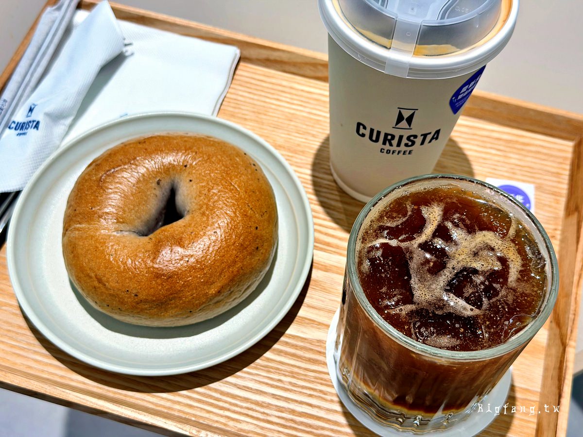 我們就隨便點了貝果、冰美式、荔枝特調咖啡。