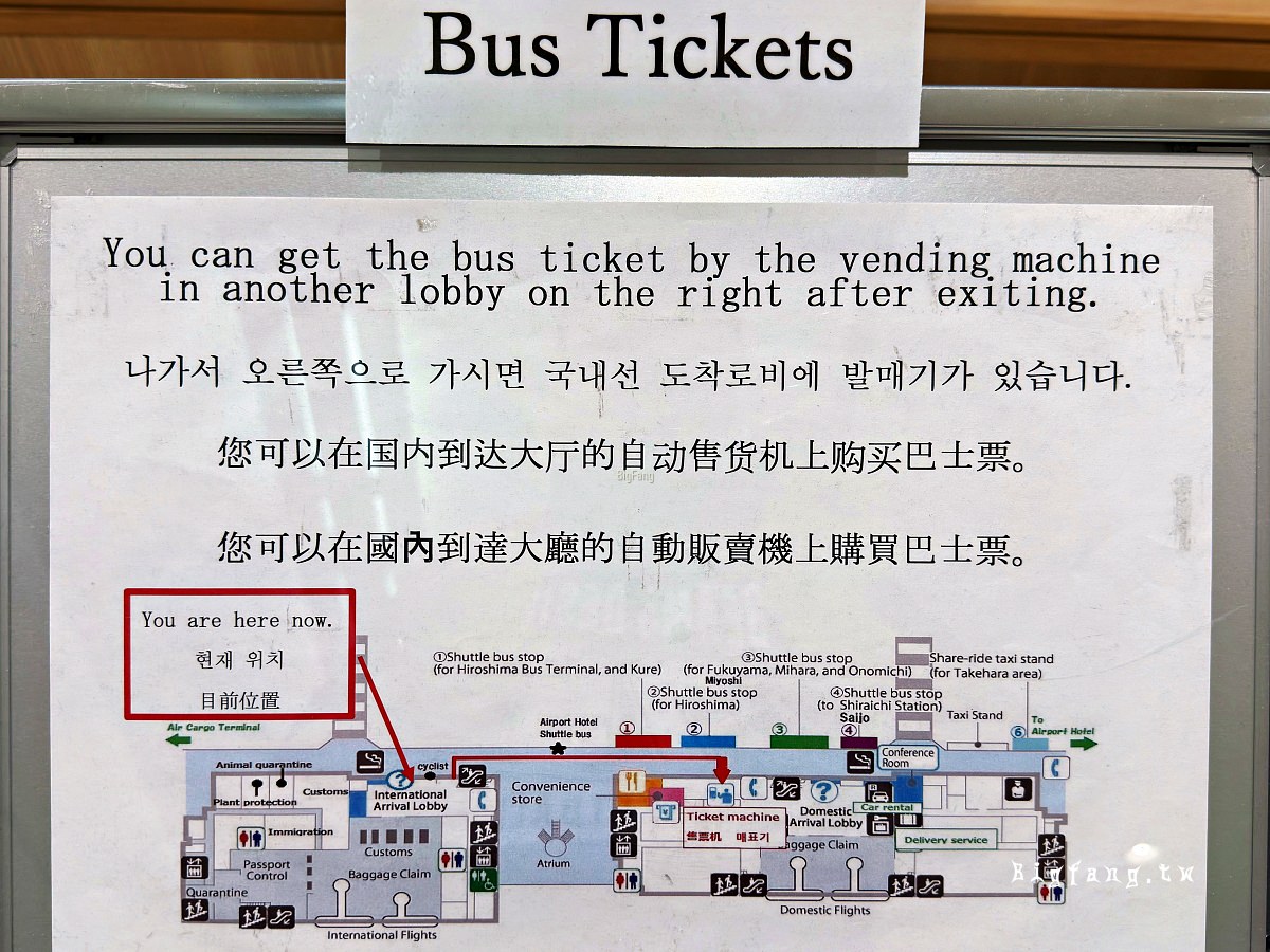 對於許久沒飛廣島的大方,研究了一下,原來要去日本國內到達大廳去買巴士票。框框的目前位置,就是國際線剛出來的位置,跟著粗紅線走,去自動販賣機去買巴士票。