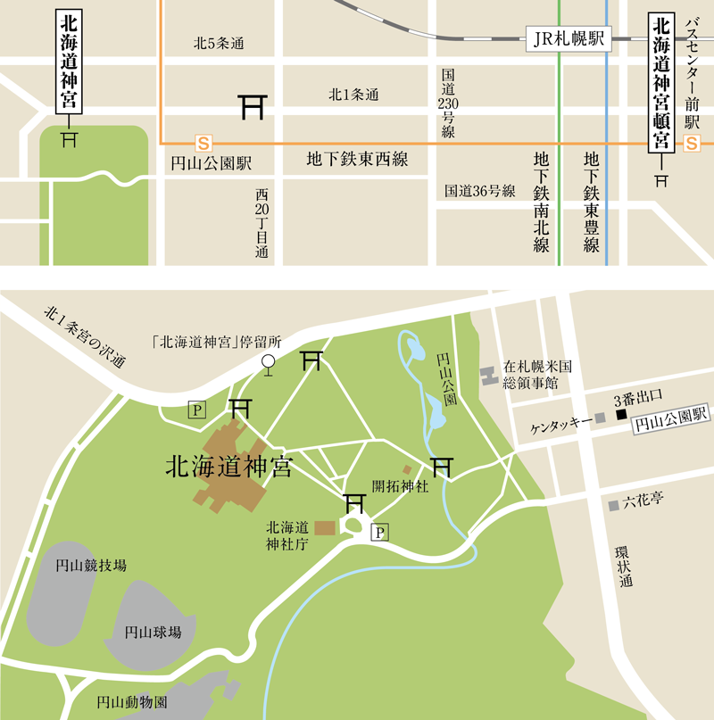 - 地鐵: 搭乘地下鐵東西線到 「圓山公園站」 下車,從 1 號或 3 號出口出來,步行約 15 分鐘就可以到神宮。