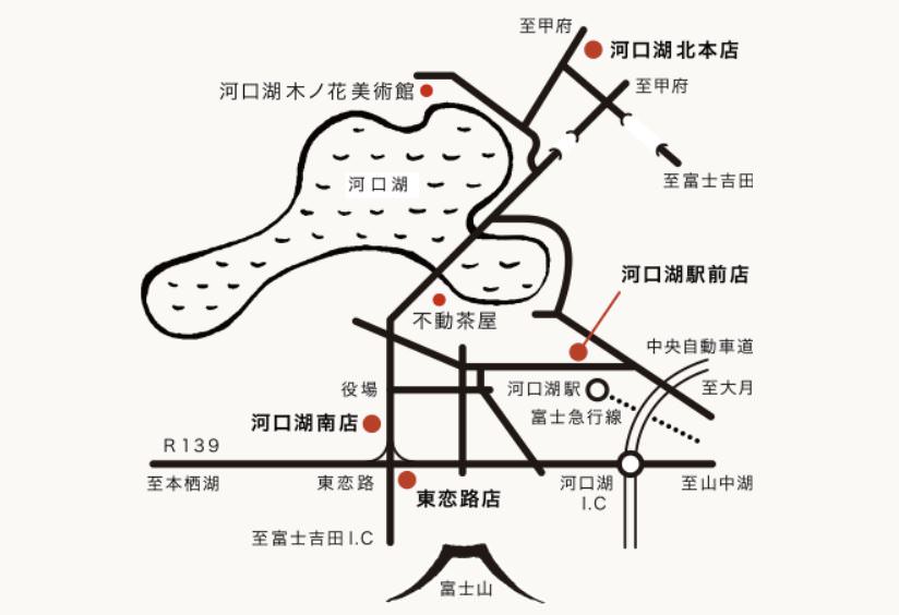 除了本篇介紹的本店之外,另外還有河口湖南店、河口湖駅前店、東戀路店。