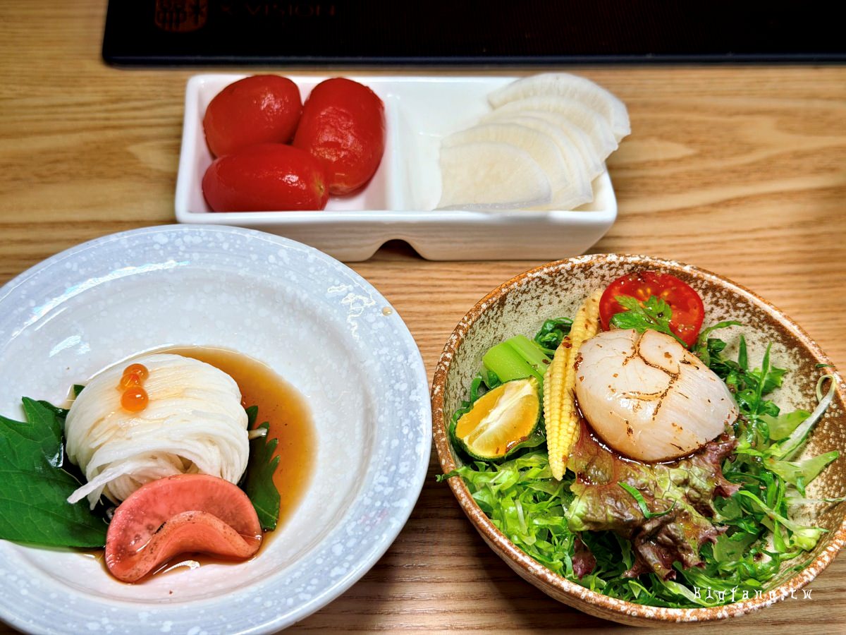 • 山藥絲細麵配鮭魚卵、生菜沙拉佐漬燒干貝