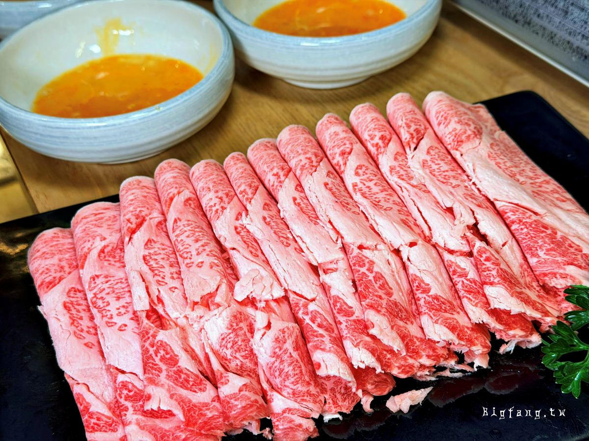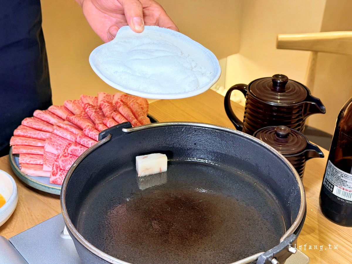 • 做法:服務人員會在桌邊先炒香糖,再加入A5黑毛和牛,淋上關西風味的甘醇醬汁快涮。