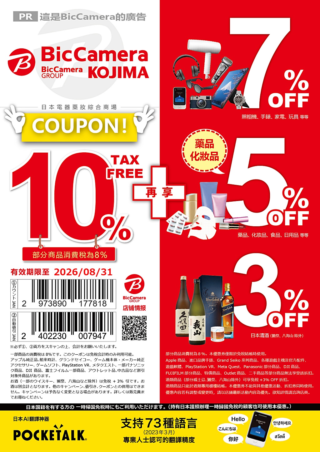 另外再追加大方每次去日本都會到 Bic Camera 的免稅優惠折扣劵。