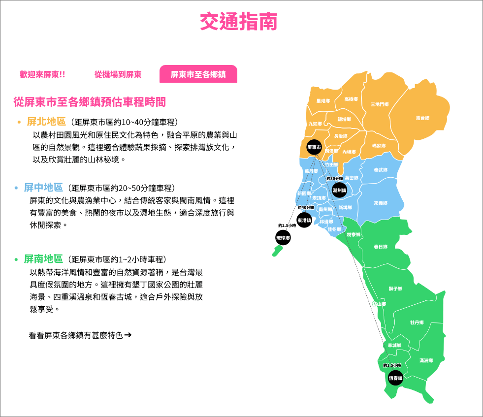 屏東縣屬於台灣西部最狹長的縣,從屏東市開車至最南端的恆春(墾丁),尚需1.5~2小時的車程。