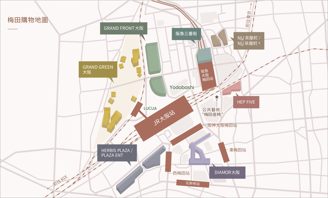 - 轉乘:可轉乘 JR 大阪站、阪急電鐵、阪神電鐵及地下鐵御堂筋線。這裡是大阪的交通心臟,去哪都方便。