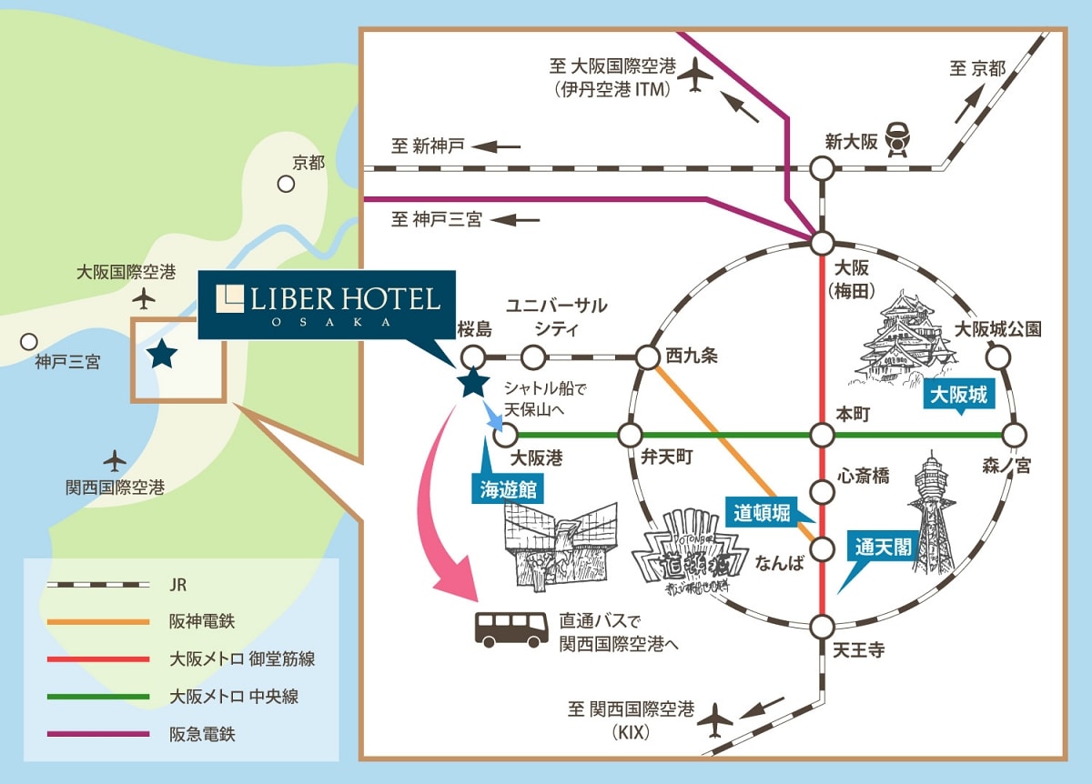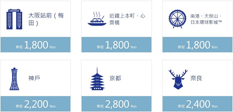 - 利木津停靠站:大阪灣格蘭王子大飯店 / 星野集團 RISONARE 大阪、天保山(海遊館)、日本環球影城、大阪環球影城city walk(近鐵環球影城酒店)、利蓓薾酒店(JR櫻島站前)