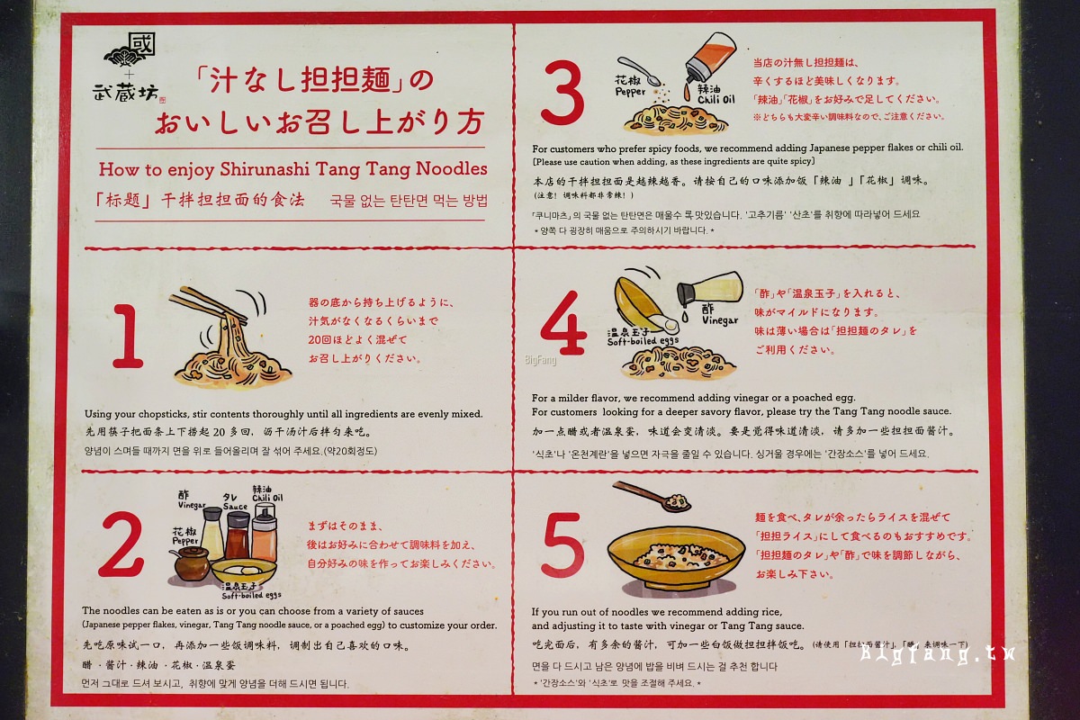 • 清爽風味:加入醋或溫泉蛋,可以使味道變得更清爽。如果覺得味道不夠,可使用擔擔麵醬汁。