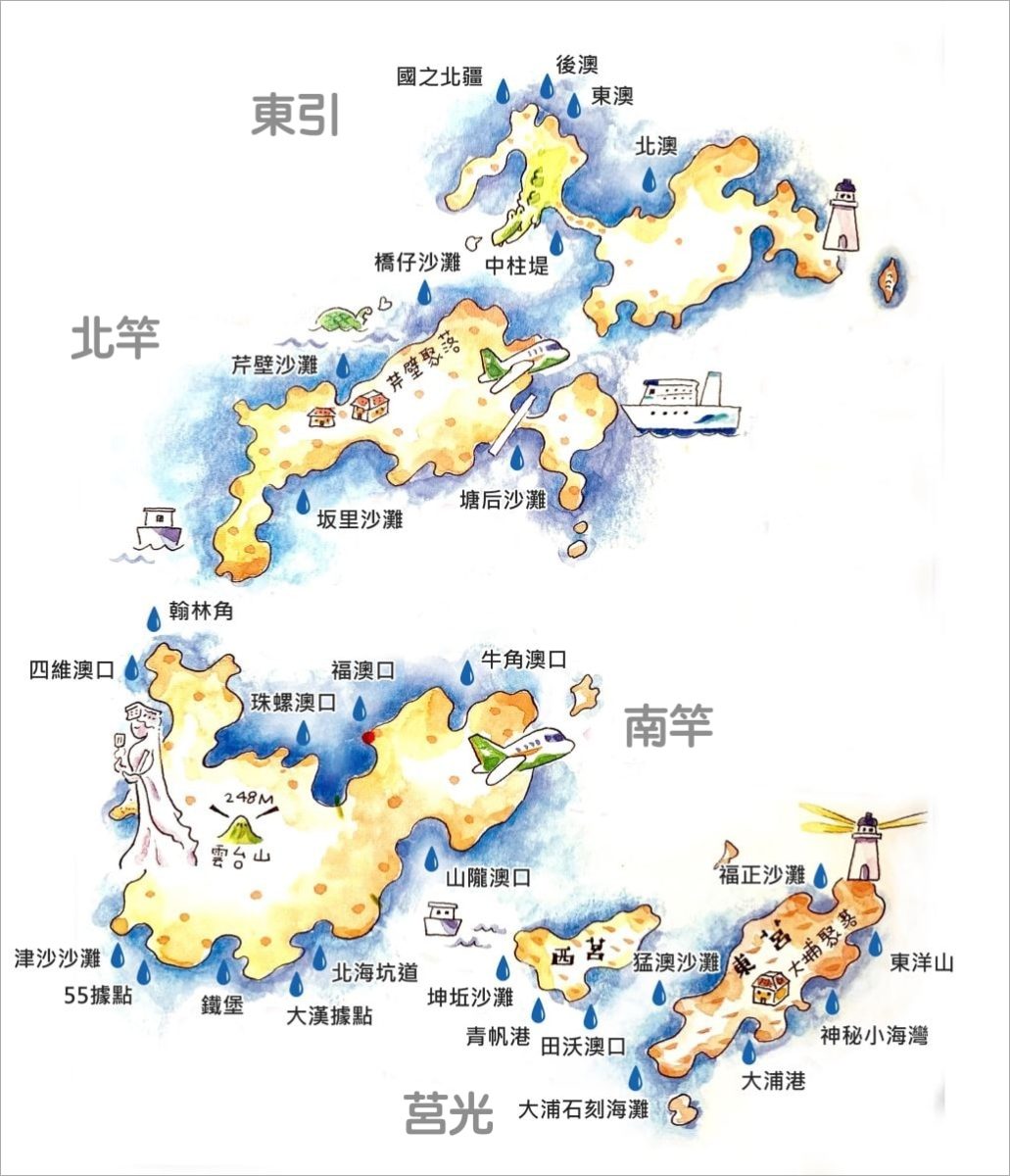 - 南竿:福澳港、珠螺灣、北海坑道、大漢據點
