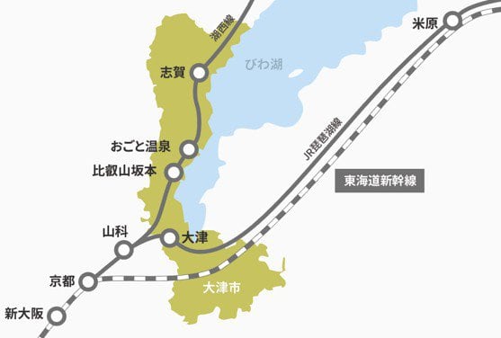 - 京阪三條站,搭乘地鐵東西線 琵琶湖濱大津站,約25分鐘