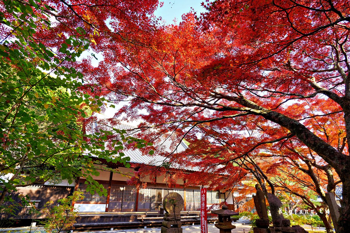 • 紅葉隧道:寺院種植了約150株楓樹,數量雖不是全縣最多,但種植密度極高。從入口山門到本堂的參道兩旁,楓樹枝葉在頭頂交錯,形成封閉式的紅色隧道,視覺衝擊力極強。