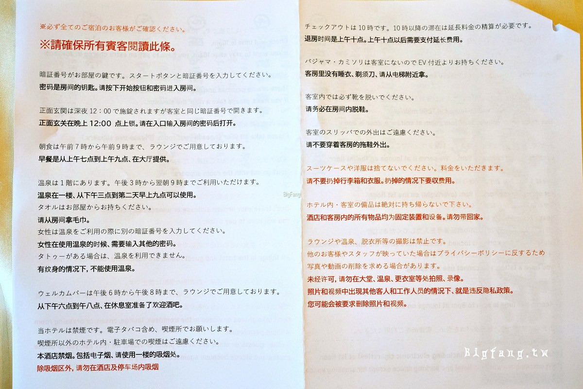 櫃台還有入住需知介紹,告知浴場、早餐、Welcome 酒吧的使用時間,另外要注意的是,房間沒電話,並且出入房間都需按密碼。