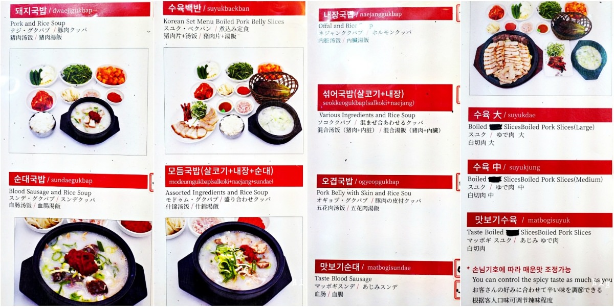水營本家豬肉湯飯 (수영본가돼지국밥) 屬於外國人友善餐廳,除韓文菜單外,也有提供外文菜單,上面有英文、日文、簡體中文、繁體中文,加上圖片,在點餐上基本上沒什麼大問題。