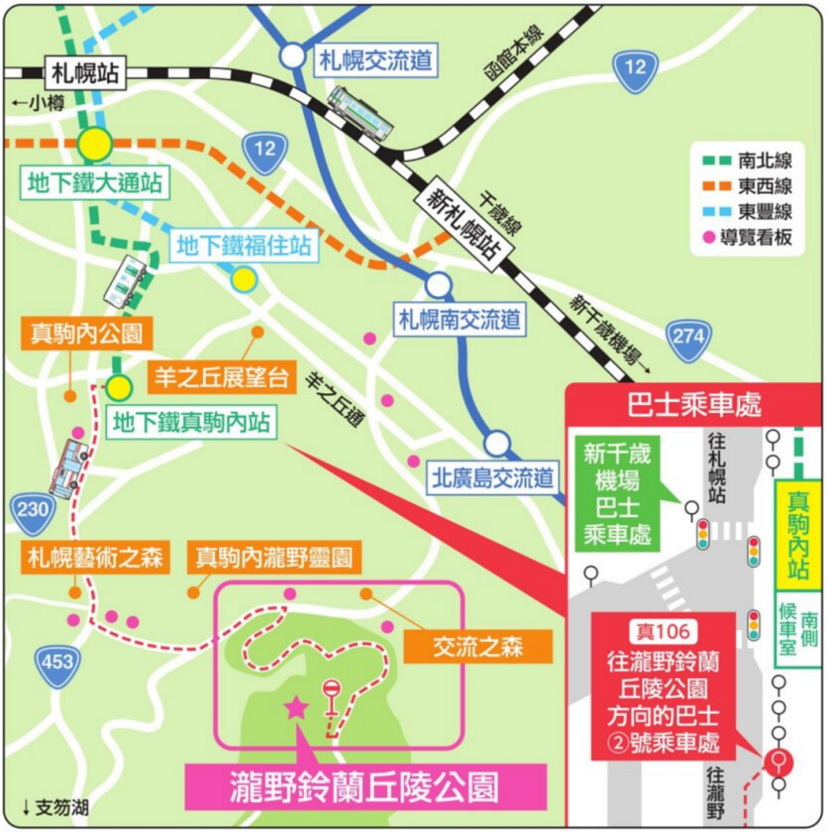 雖然在地下鐵「真駒內」和「福住」都可以轉乘巴士,但「真駒內」的班次比較多,「福住」的轉乘巴士一天只有四班車,而且只有在4月20日~11/10 週末和節假日運行 (7/16~8/16 加開平日運行)。