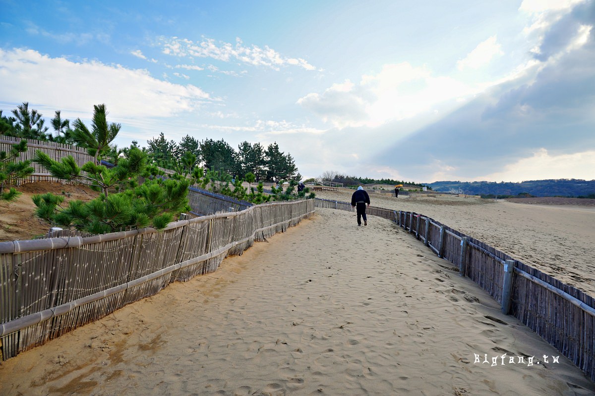 鳥取砂丘大概就是所謂的觀光客景點,走到沙子上有點累,有人說夏天來時,沙子高溫容易燙傷!不過看著遠方的砂丘跟海岸線,也算是挺壯觀的!簡單來說,這個景點有點無聊XD,拍照打卡的時間也花不了多少,如果來到鳥取,就加減來一下吧。