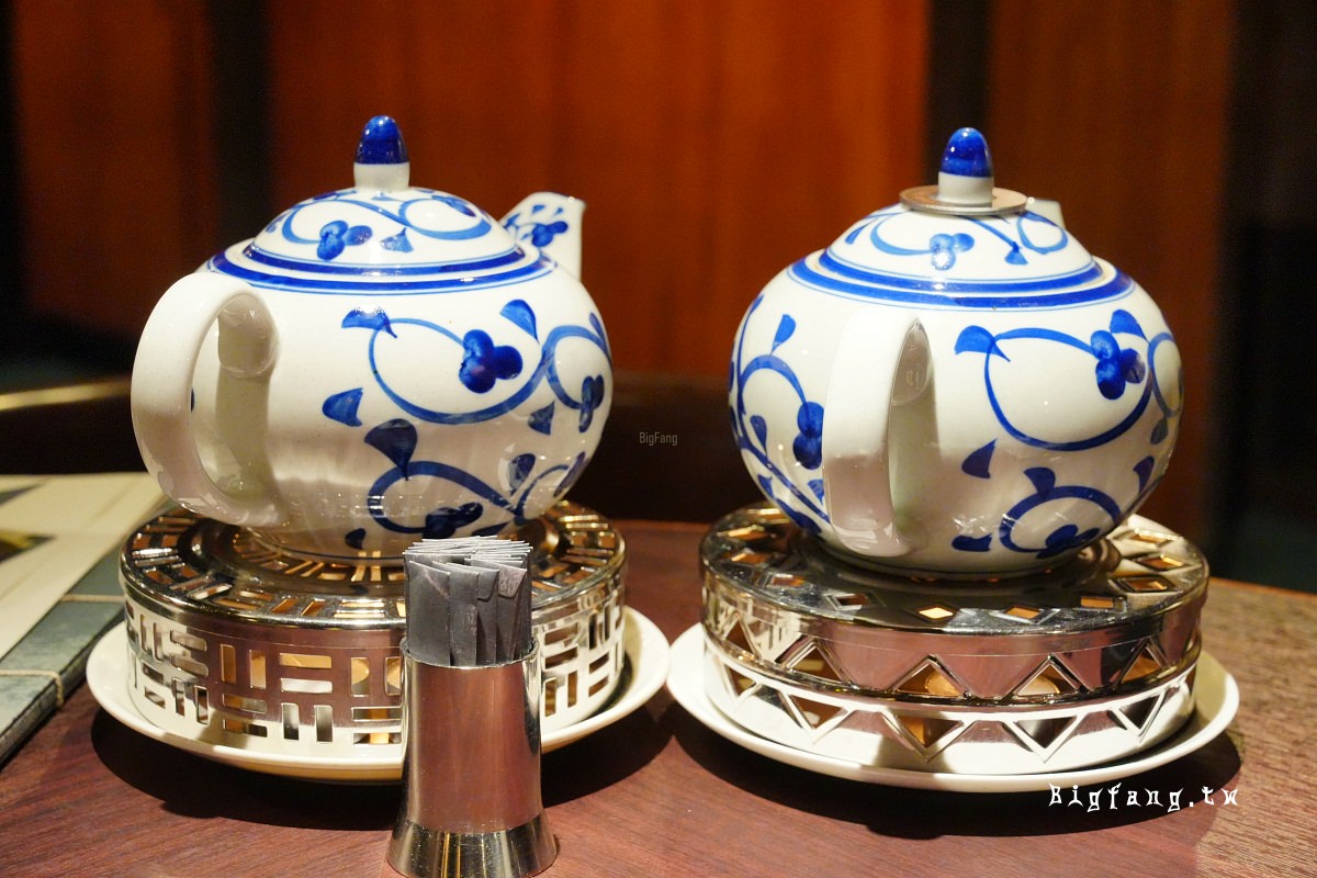 茶葉有香片、龍井、普洱、鐵觀音等選擇,桌上一壺是茶、一壺是白開水。鐵觀音喝起來醇厚、回甘明顯且餘韻悠長,好喝又能解膩。